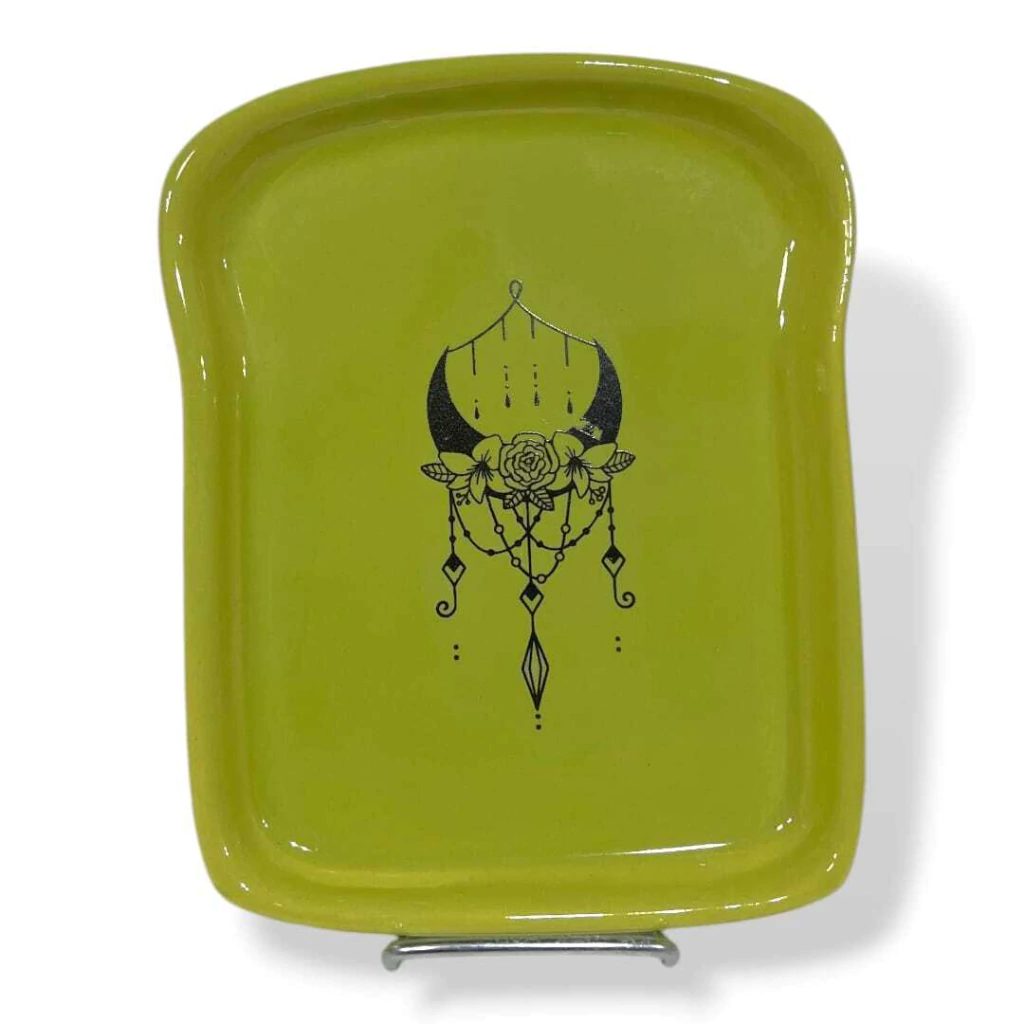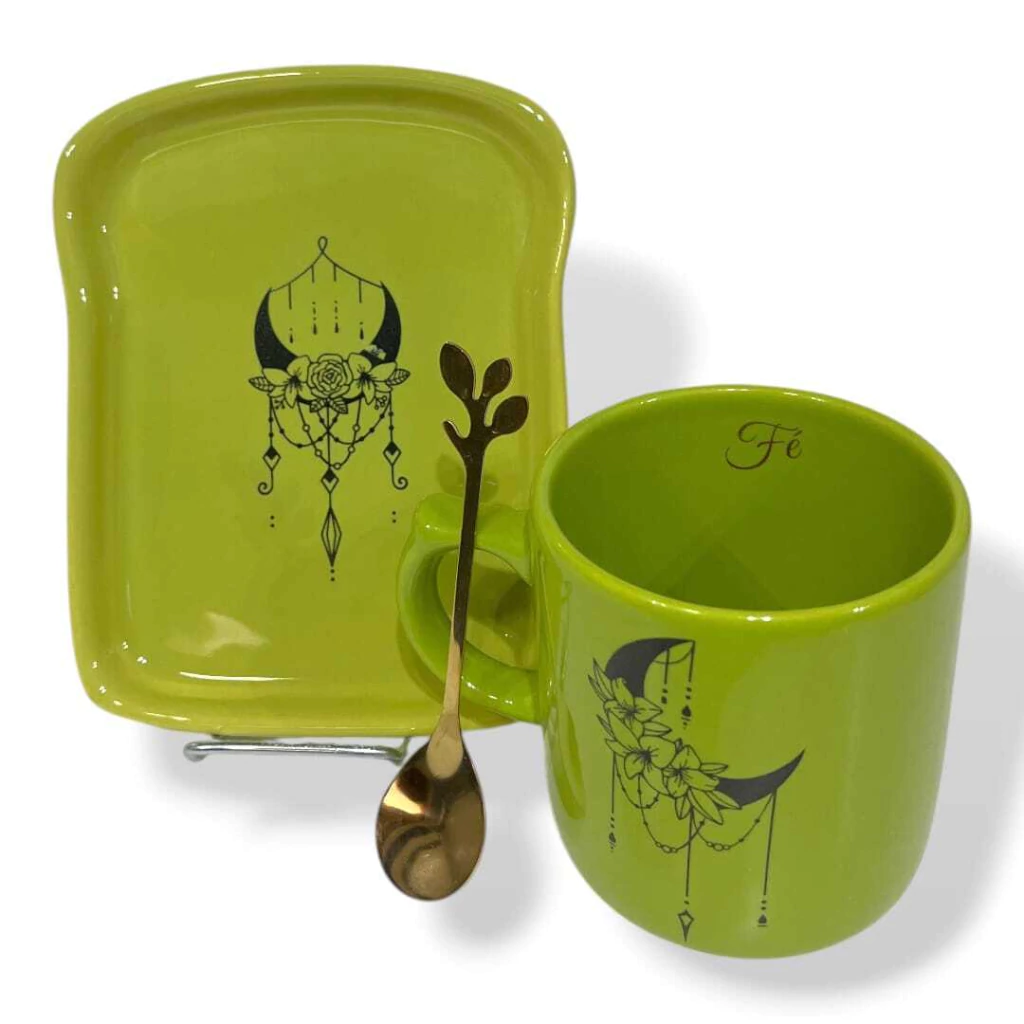¡Comenzá tus mañanas con un toque de misticismo y encanto bohemio con el Set Desayuno Místico - Luna Floral! Este set encantador combina una taza europea cerámica y una bandeja para tostadas con un diseño de luna creciente adornada con rosas y elementos colgantes en tonos negros sobre un fondo verde vibrante, ideal para transformar tu desayuno en un momento mágico y especial.