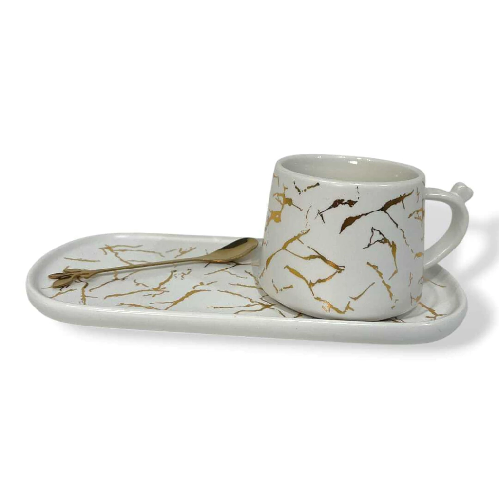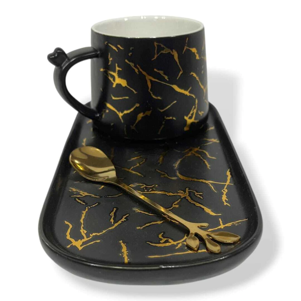 ¡Elegancia Dorada en Cada Sorbo con el Set de Café Cerámica Gold Marble Adventure! Esta pieza importada presenta un diseño lujoso inspirado en mármol negro con vetas doradas, evocando la técnica kintsugi con toques de sofisticación y misterio. Incluye taza de 350 ml, plato ovalado y cuchara dorada, perfecto para café, té o chocolate en casa, la oficina o momentos de lujo cozy, combinando elegancia atemporal con un toque felino sutil y festivo.