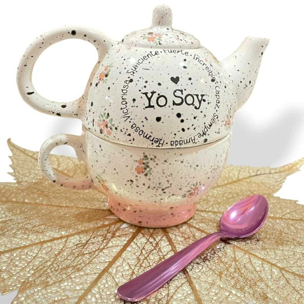 ¡Celebra el Día de la Madre con esta elegante Tea For One Jaspeada! Diseñado con un acabado único en tonos rosados y blanco con detalles jaspeados, esta hermosa tetera + taza combina estilo y funcionalidad. Perfecta para disfrutar de tu bebida favorita, incluye la inscripción "YO SOY" con un toque especial de color, ideal para sorprender a esa madre especial.
